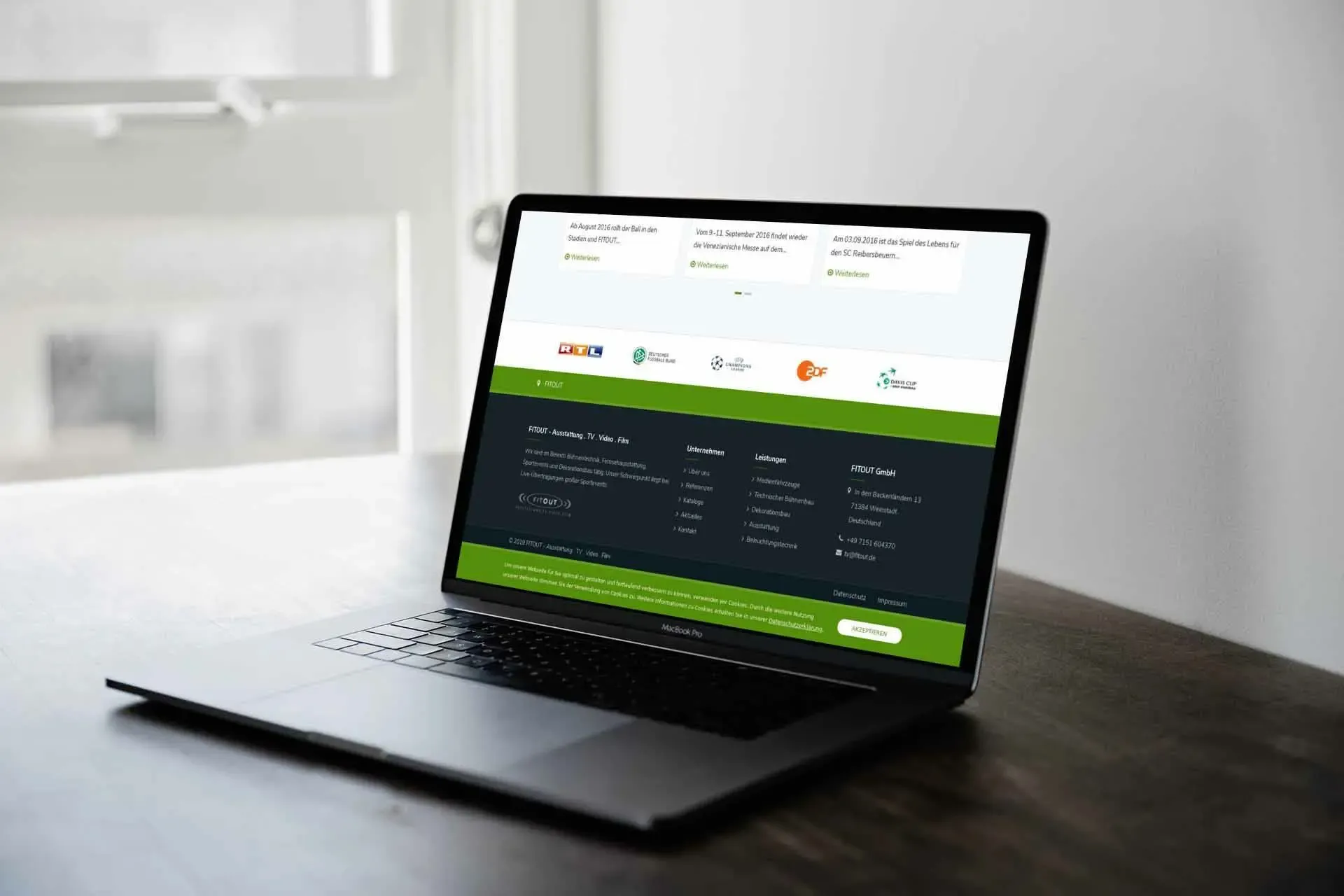 Die FITOUT GmbH ist seit beinahe 30 Jahren im Bereich Bühnentechnik, Fernsehausstattung, Sportevents und Dekorationsbau tätig. Sie unterstützt langjährige Kunden wie die ARD, das ZDF, Sky und RTL bei nationalen Events, sowie bei Europa- und Weltmeisterschaften verschiedenster Sportarten.